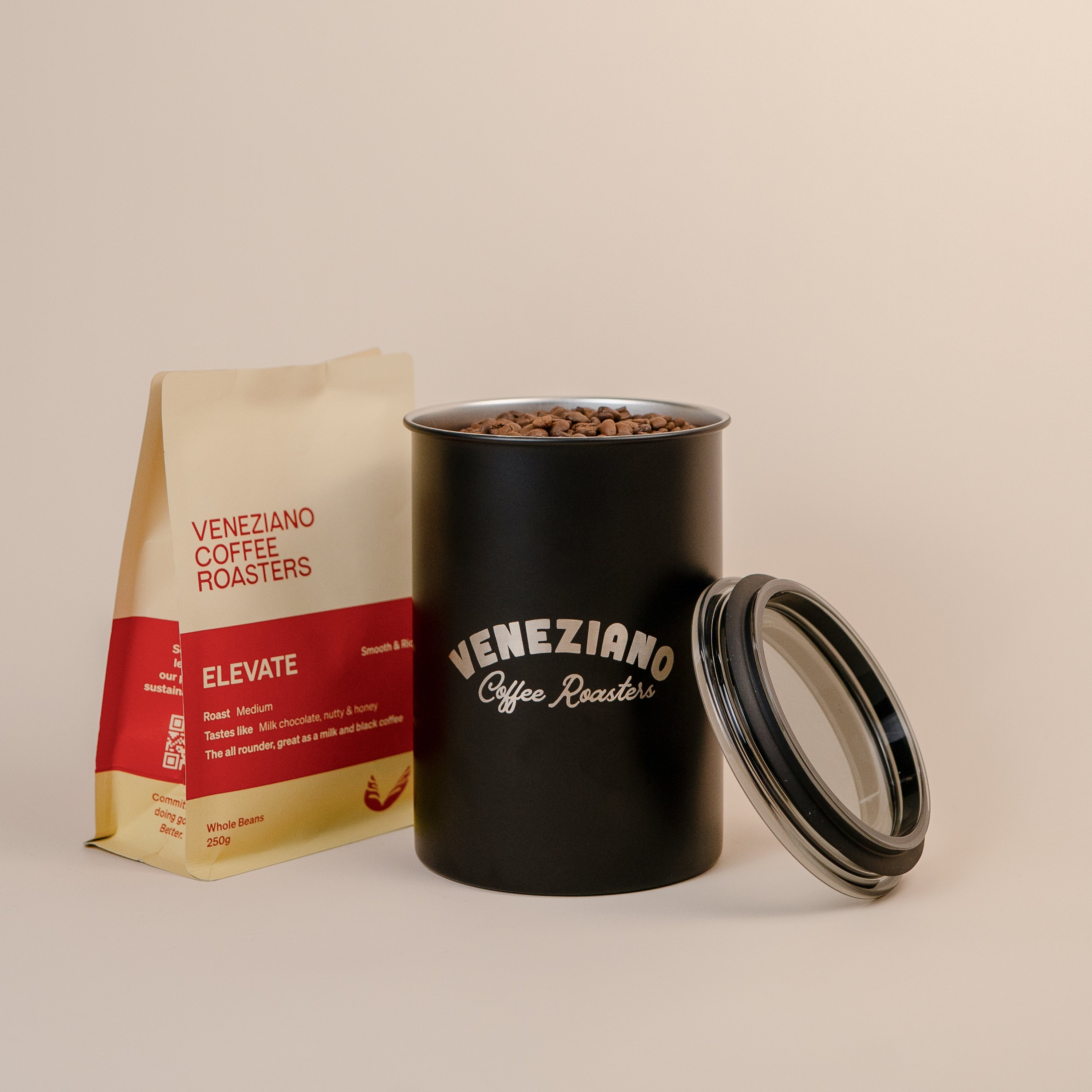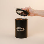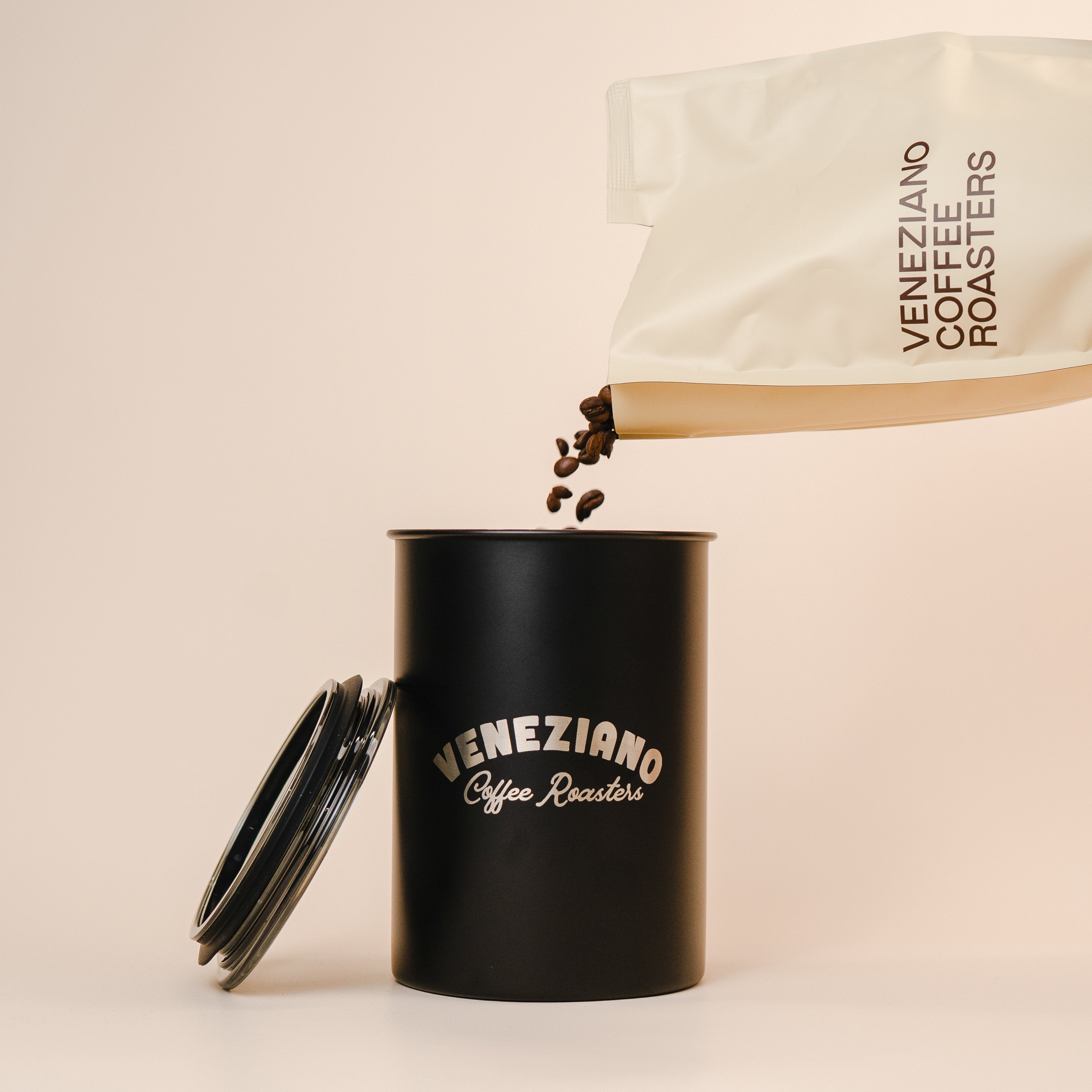 Airscape Coffee Canister laser etched with the new Veneziano curved logo.