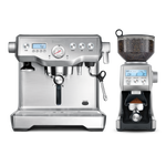 The Dynamic Duo pairs Breville's Dual Boiler espresso machine with the Smart Grinder Pro. It's a matched setup designed to work together—precision grinding feeding into temperature-controlled brewing. Two separate boilers for espresso and steam, 60 grind settings on the grinder, and the kind of control that lets you dial in your shots properly.