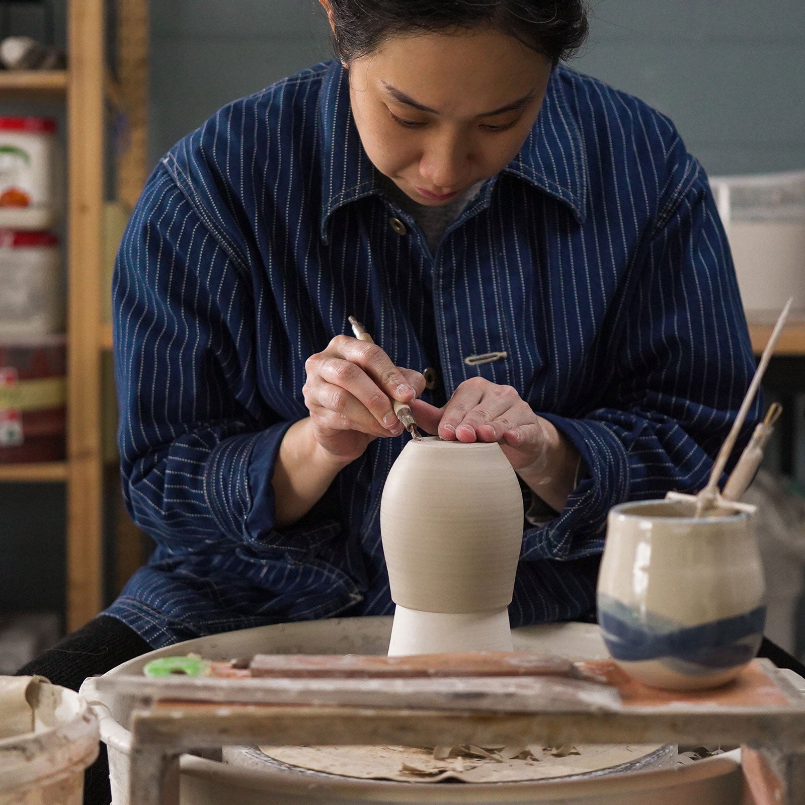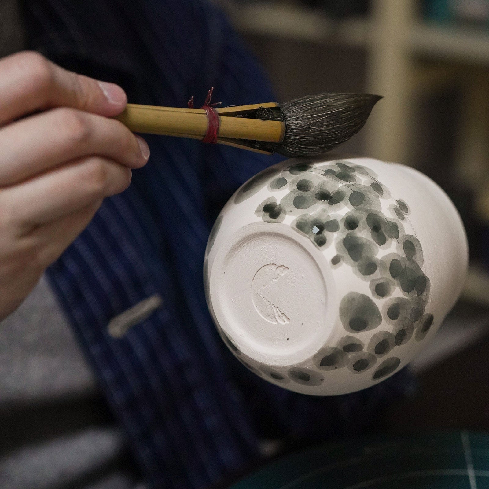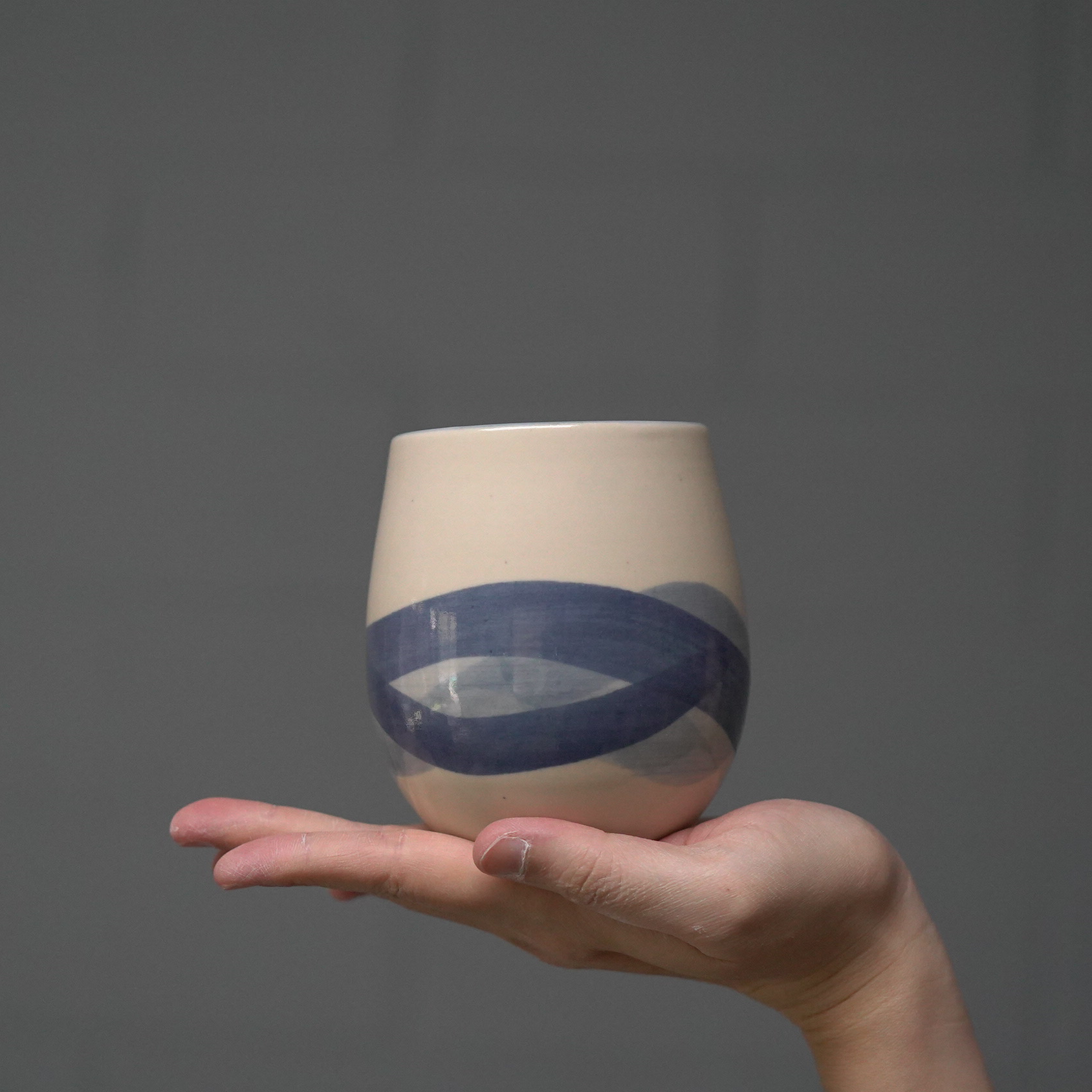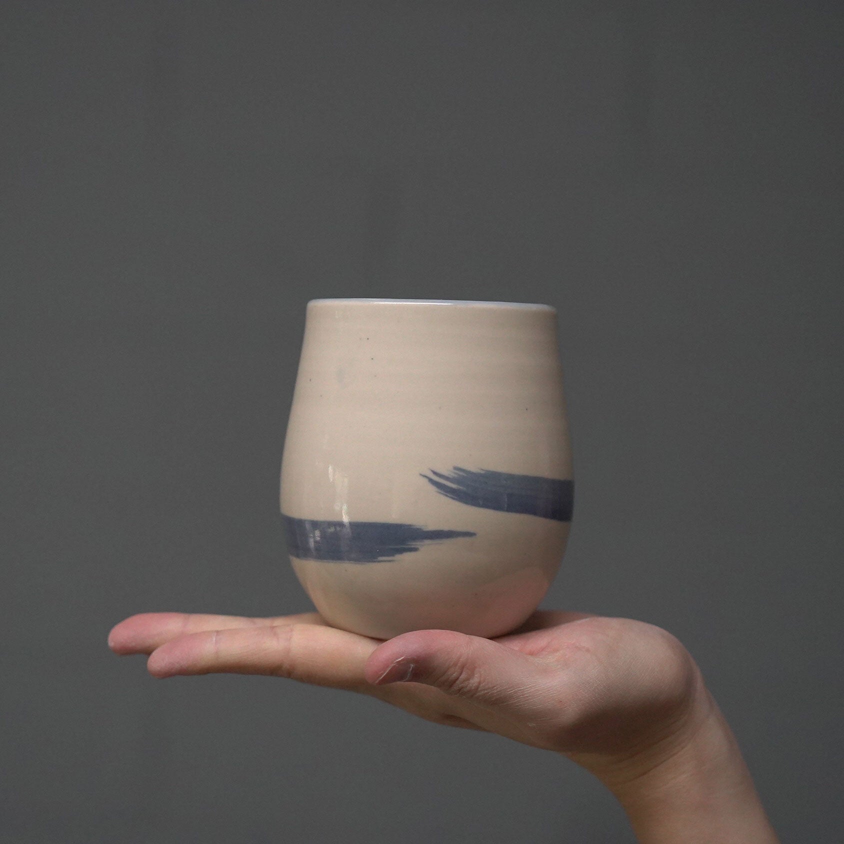 Audrey has incorporated the use of Gosu, a traditional Japanese blue pigment which adds individuality to each cup. The brushstrokes introduce subtle variations. Every cup is unique and has its own personality.