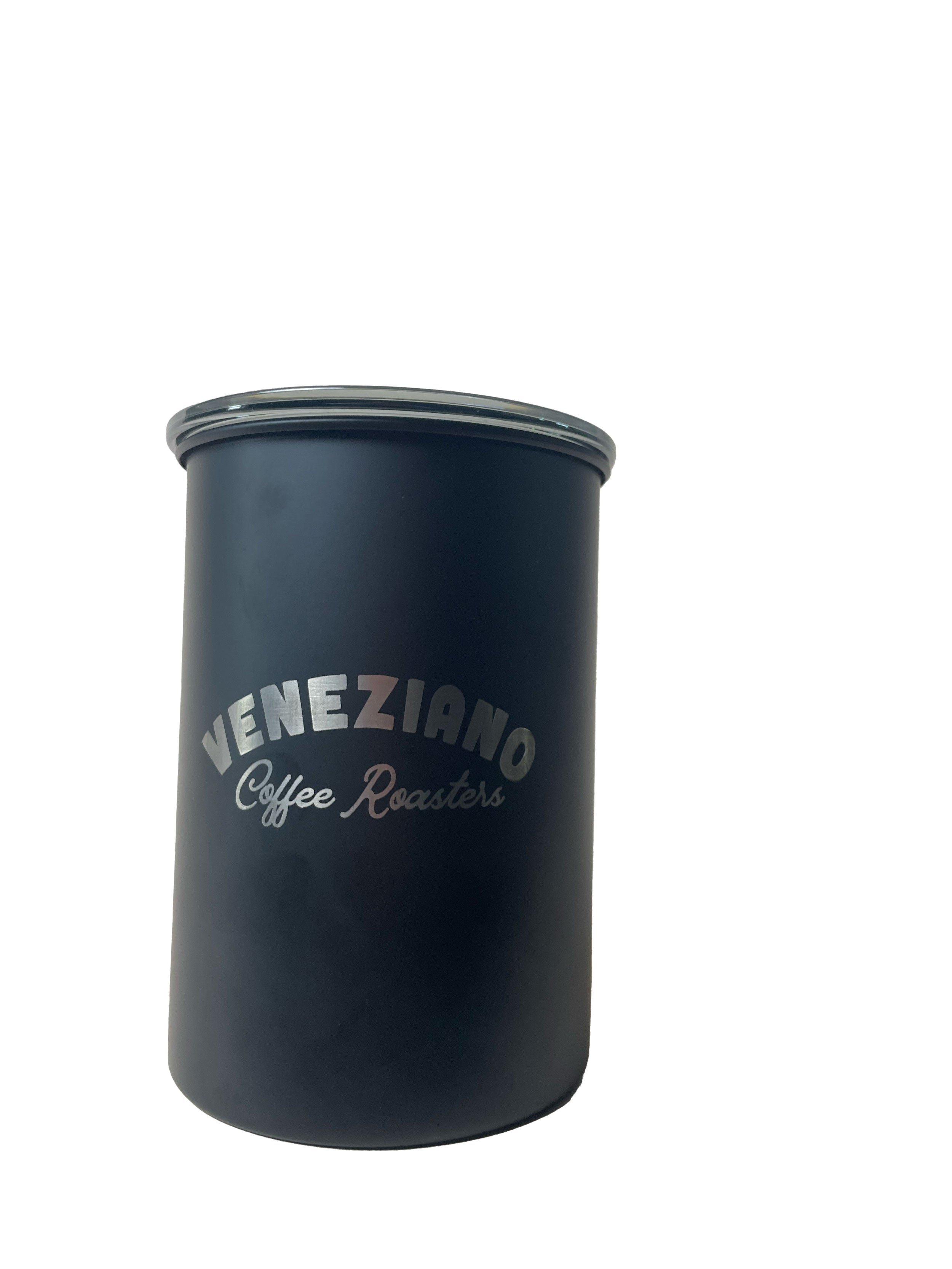 Airscape Coffee Canister laser etched with the new Veneziano curved logo.