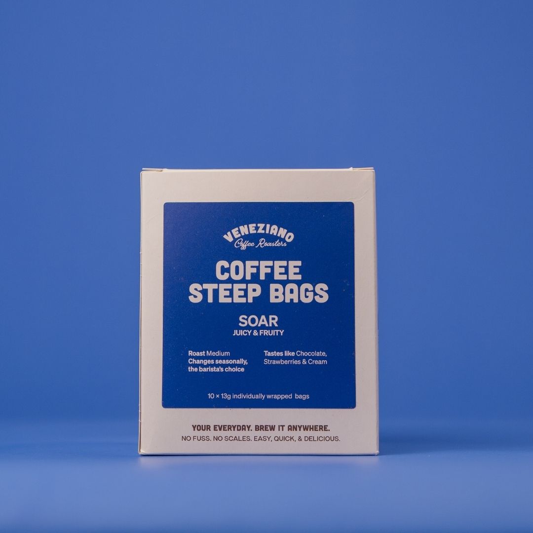 Steep Bags are our latest creation. We have taken our Soar seasonal blend with notes of chocolate, strawberries & cream and ground into an individuallly wrapped Steep bag. Just place the steep bag in your cup and pour over 230ml of hot water. Steep for 5 mins.